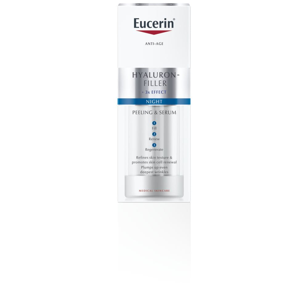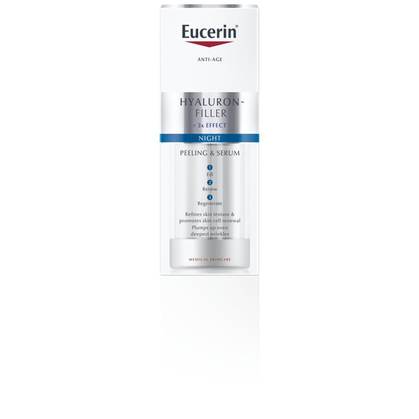 Eucerin Hyaluron-Filler Concentrate is an intensive anti-wrinkle serum designed to be used daily in combination with Eucerin Hyaluron-Filler day and night creams. It boosts the moisturizing and wrinkle-filling benefits of the care products in the range. Eucerin Hyaluron-Filler Night Peeling & Serum has been formulated for use overnight in conjunction with Eucerin Hyaluron-Filler Night. Like the concentrate, Eucerin Hyaluron-Filler Night Peeling & Serum contains concentrated Hyaluronic Acid to increase skin moisturization. It also contains an AHA (alpha-hydroxy-acid) Complex for exfoliation.