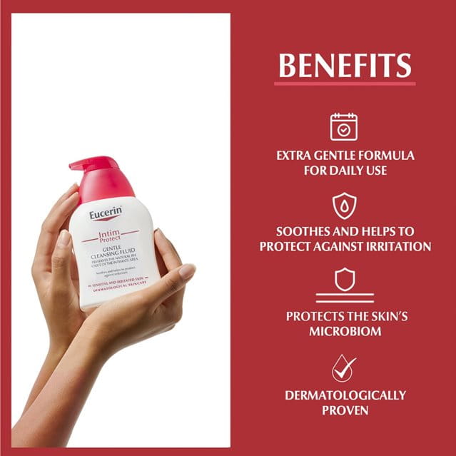 Skin in the intimate area is especially sensitive and if its natural barriers are affected, it can become susceptible to irritation, discomfort and even infections. That’s why it needs a mild and soothing cleansing product. Eucerin Intim-Protect has a pH value of 4.5, adapted to that of the female intimate area, and a mild surfactant tenside system. Formulated with skin’s own Lactic Acid, it maintains the natural vaginal microflora, while soothing irritations. Use daily to cleanse, care and comfort.